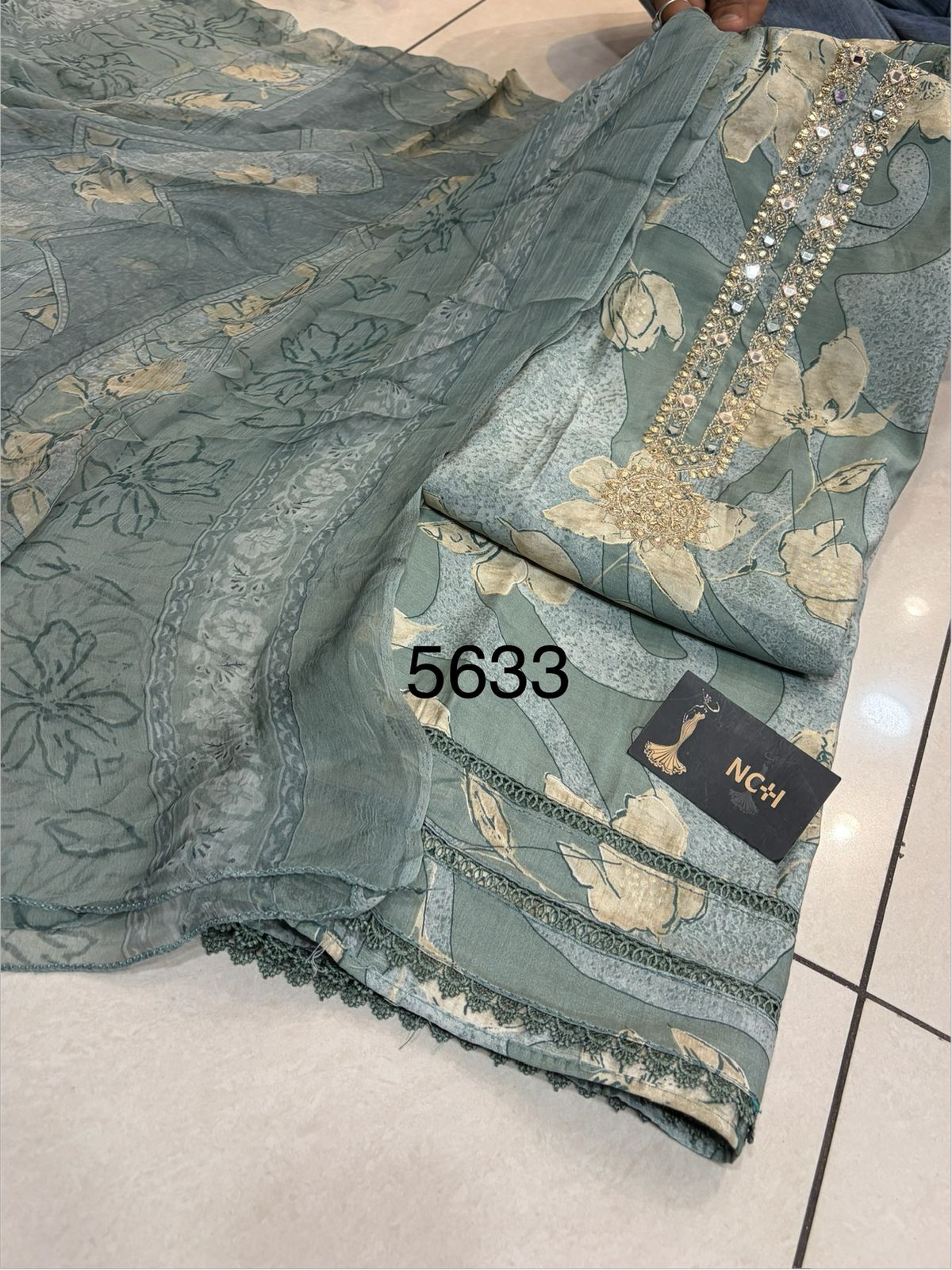Top modal masline digital print neck emboirdrg ghera lace work